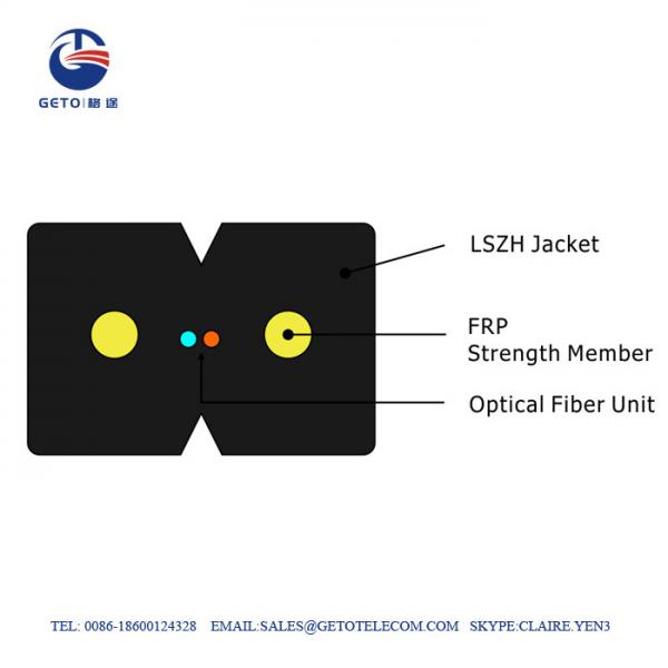 GJPFH fiber optic cable The fiber cores is in the central of micro loose tube, the micro tube is make of low-smoke zero halogen(LSZH) material. Two FRP tubes are used as tensile elements at the two side of the cable. The cable outer sheath is made of white low-smoke halogen-free polyolefin, and two protruding lines are added on the surface of the cable sheath which is used for cable positioning identification when branching the core.